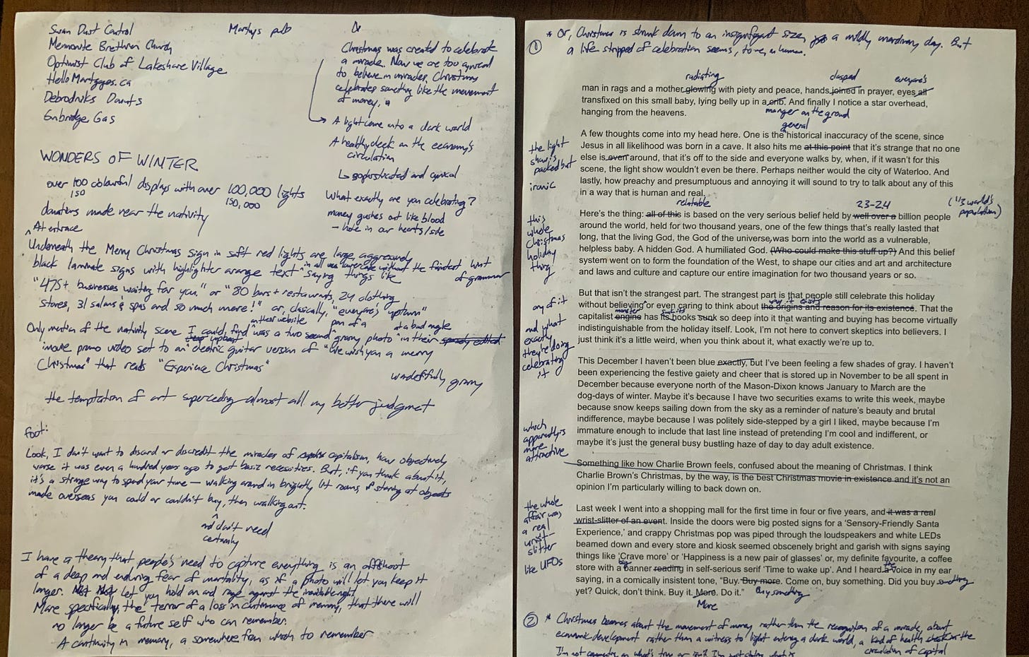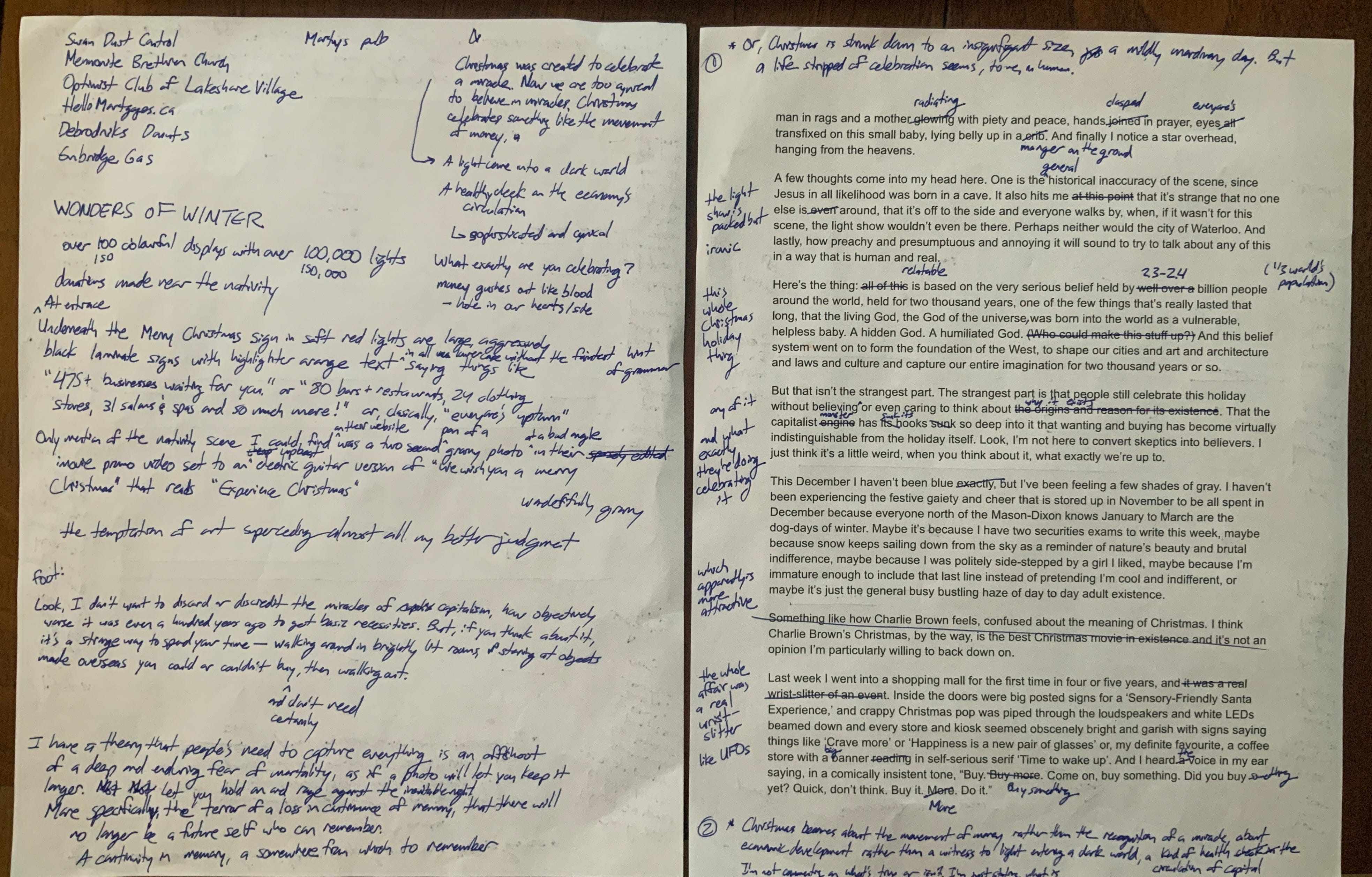 And I should be studying for my securities exams or shovelling or gathering my courage but instead I’m sitting up at 10:30PM, well past my bedtime, listening to the cackling laugher from my roommate’s Christmas party going on in the living room, feeling like a fitting soundtrack to this whole charade, not editing sentences that don’t make perfect sense because the energy is there, because that’s how I first wrote it down before censoring myself, because this essay had to come out of me.